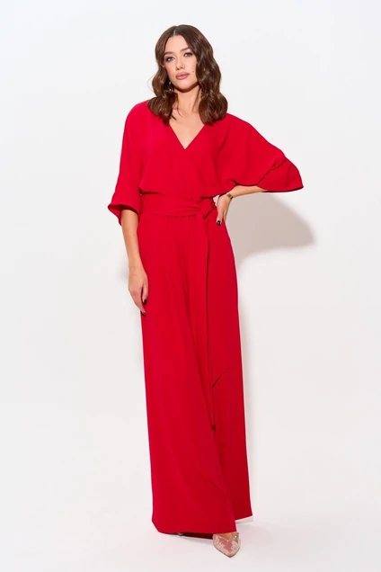 Нарядный комбинезон полуприлегающего силуэта с расширенными книзу брюками из струящейся ткани. Комбинезон отрезной по линии талии на резинке, верхняя часть комбинезона на запах. Рукав цельнокроеный длиной до локтя. По спинке V-образный вырез, в среднем шве центральная застежка на потайную молнию. В боковых швах карманы. В комплект входит пояс из основной ткани. Длина комбинезона: 158см Длина рукава: от горловины 27см