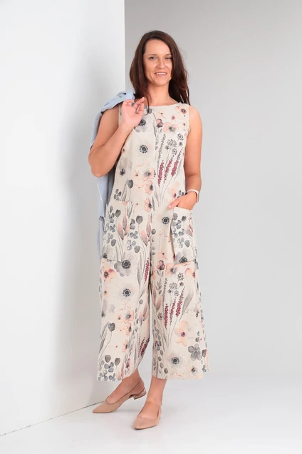 Комбинезон полуприлегающего силуэта. В верхней части спинки запах. На передней половинке накладные карманы с отлетными краями. Длина от проймы до низа по боковому шву 105