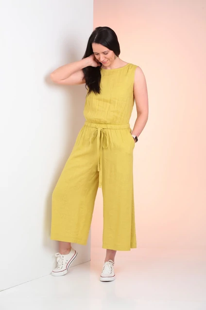 Комбинезон женский без рукавов с кулисой по линии талии. В боковых швах карманы. Застежка на потайную молниюс среднем шве спинки.