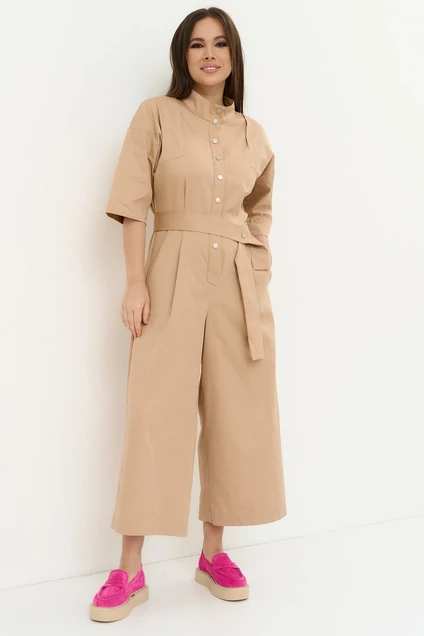 Стильный комбинезон прямого силуэта длиной 7/8,с центральной застежкой на металлические кнопки. Воротник оформлен стойкой. Рукав средней длины. Комбинезон с отрезной талией, по линии талии по спинке присборен на эластичную тесьму. Дополнен удобными карманами. Приталнен за счет съемного пояса на металлических кнопках, выполненного из основной ткани. Длина комбинезона от плечевого шва 136 см. Длина рукава 35 см.
