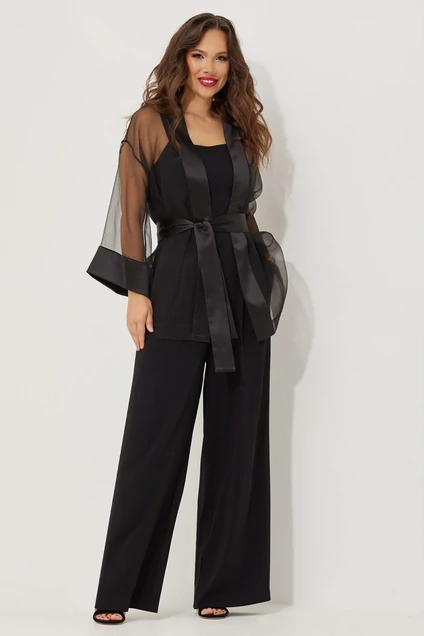 Стильный комплект из комбинезона и блузы в стиле кимоно. Комбинезон приталенного силуэта на тонких регулируемых бретелях. Выполнен из струящейся костюмно-плательной стрейчевой ткани. Талия отрезная. Застежка по спинке на потайную молнию. Брюки широкие, длинные. Комбинезон дополнен боковыми карманами. Блуза свободного кроя с атласной отделкой. Выполнена из органзы средней плотности. Органза отлично держит форму, что придает особый воздушный объем. Рукав спущен, 3/4. Блуза без застежки. В комплекте пояс из атласной ткани.