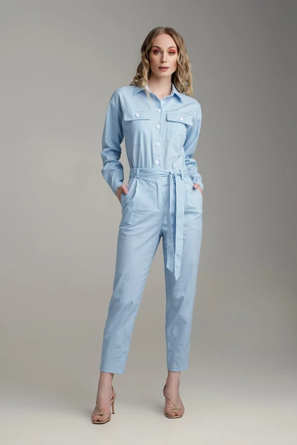Комбинезон женский выполнен из хлопковой ткани, прямого силуэта, отрезной по талии. По переду накладные карманы и застежка на петли и пуговицы. Рукав рубашечного типа с манжетой, а так же с застёжкой на петли и пуговицы. Воротник отложной с отрезной стойкой. Брюки зауженные к низу, со складками и боковыми карманами, с зади накладные карманы. По низу брюк вытачки. По талии резинка. В комплект входит пояс из однотипной основной ткани.