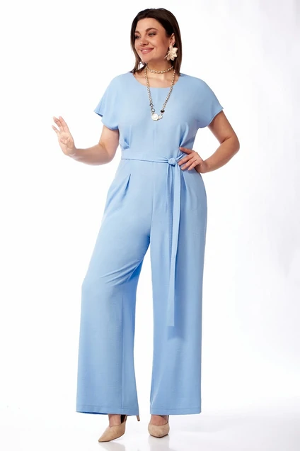 Комбинезон полуприлегающего силуэта с цельнокроеным коротким рукавом. По переду выполнены складки с поясом.Горловина круглая. По спинке, в среднем шве вставлена потойная молния. В боковых швах выполнены карманы.