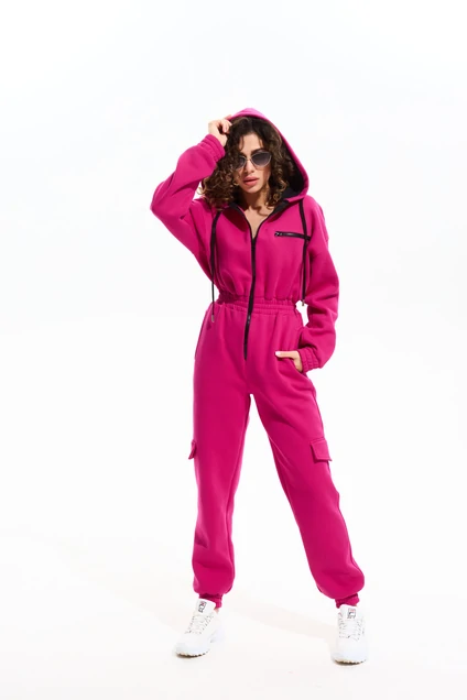 Комбинезон женский прямого силуэта, с цельно-кроенной застёжкой на тесьму "молния" и широкой резинкой по талии. Спереди декоративная нагрудная молния, боковые фигурные карманы и настрочные клапаны. Капюшон на подкладке контрастного цвета с люверсами и завязкой на шнур. Низ брюк и рукавов на притачной манжете с резинкой.