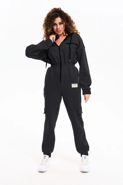 Комбинезон женский прямого силуэта, с цельно-кроенной застёжкой на тесьму "молния" и широкой резинкой по талии. Спереди декоративная нагрудная молния, нашивка и боковые фигурные карманы и настрочные клапаны. Капюшон на подкладке контрастного цвета с люверсами и завязкой на шнур. Низ брюк и рукавов на притачной манжете.