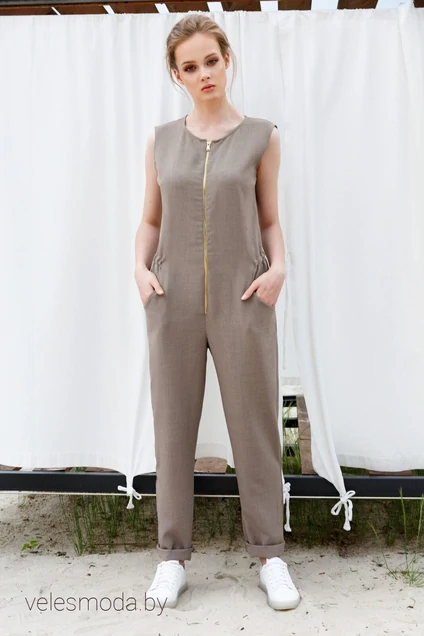 Комбинезон женский, прямого силуэта, с целнокроенной застёжкой на металлическую тесьму "молния". Перед с рельефами, переходящими в карманы. От рельефа до центра спинки кулиска со шнуровкой. Спинка с кокеткой, складкой и декоративной нашивкой.
