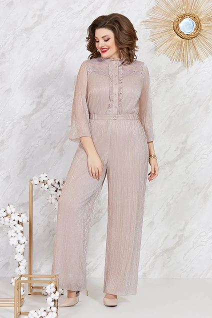Роскошный комбинезон, выполнен из плиссированной ткани (тянется) и обработан подкладкой (тянется). Лиф комбинезона отрезной по линии талии с втачным поясом, по полочке обработана застежка с притачной планкой, на петли-пуговицы. Горловина обработана стойкой из основной ткани и декорирована рюшей, также на лифе обработаны кокетки из кружева в тон основной ткани. Брюки комбинезона свободного покроя, расклешенного силуэта, на трикотажной подкладке, с застежкой на молнию. Рукав втачной, оптимальной длины, из основной ткани. Спинка идентична переду, также с кокеткой из кружева. Шикарный комбинезон, продуман до мелочей, очень удобный и эффектный! Прекрасная альтернатива вечернему платью, только в нем будет еще комфортнее!