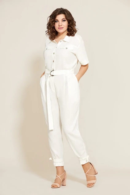 Комбинезон женский брючный, классический, со спущенным плечом. Выполнен из льняного полотна (не тянется). Комбинезон отрезной по талии. Верхняя часть комбинезона с планкой на застежке доверху. Воротник рубашечного типа, рукав втачной. В шве притачивания кокеток нагрудные клапаны, закрепленные к основной детали пуговицей. Нижняя часть комбинезона (брюки) по переду со складками и гульфиком на молнию, по спинке собрана на резинку. Брюки заужены к низу, в боковых швах обработаны карманы. Декором служит пояс из ткани и завязки – бантики по низу брюк. Длина комбинезона по спинке до талии – 49 см. Длина рукава – 21 см. Ширина рукава в пройме – 47 см. Длина брюк – 100 см.