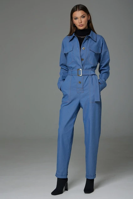 Комбинезон женский, покроя спущенное плечо ("оверсайз"). Выполнен из джинсовой ткани. Силуэтная форма комбинированная, "оверсайз" с элементом приталивания по талии за счет вставки на резинке. По переду расположены накладные карманы с клапанами. Застежка на планку на петли и пуговицы. В области бедер расположены накладные карманы с наклонным боковым входом. Горловина оформлена стояче-отложным воротником с цельнокроеной стойкой. Низ брюк в комбинезоне оформлен манжетами. Рукава длинные, одношовные, с подгибкой по низу. Спинка резная, вставка по талии в виде пояса на резинке. Отделкой в данной модели служит фурнитура. Строчки выполнены контрастными нитками.
