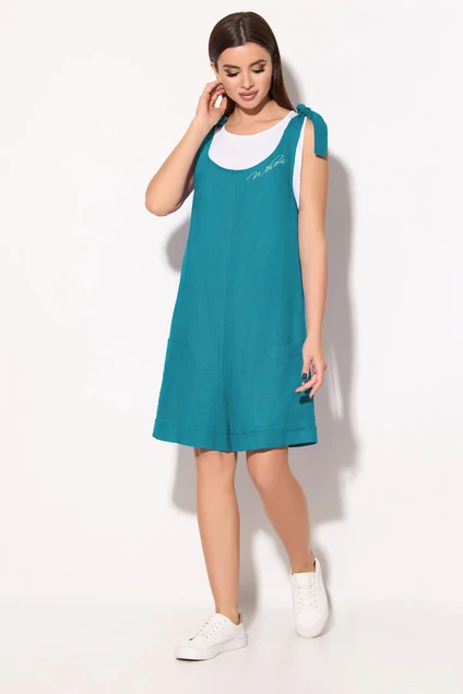 Комбинезон свободной формы с накладными карманами на завязках, по переду декоративная печать. Длина изделия: 95 см.