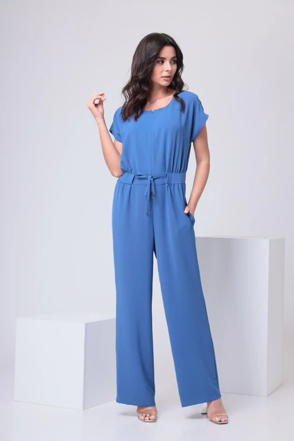 Комбинезон отрезной по линии таллии с притачным поясом, брюки прямые свободной формы с карманами. По переду потайная молния- застежка.