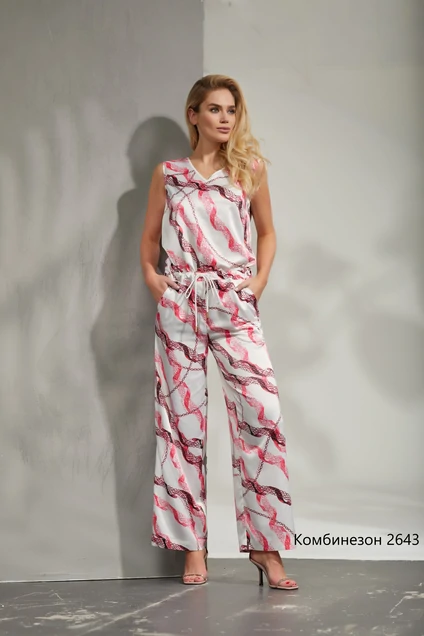 Стильный и изящный женский комбинезон из французского крепа с модным принтом. Модель свободного кроя на линии талии вставлена тесьма. Комбинезон с застежкой по спинке на петли и пуговицы. Комбинезон с функциональными боковыми карманами. Модель универсальна и подойдет любой фигуре.