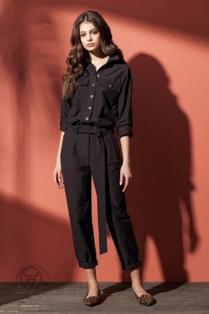 Стильный комбинезон из хлопка. Лиф комбинезона прямого силуэта с большими накладными карманами и застежкой на петли и пуговицы в натуральном стиле по планке. Линия плеча спущена, рукава объемные с верхним швом и на притачной манжете по низу, застегивающейся на две петли и две пуговицы. Спинка с горизонтальной кокеткой по линии лопаток. Брюки комбинезона на широком поясе и со съемным ремнем, завязывающимся спереди. Брюки комбинезона с двумя небольшими складками и с боковыми наклонными карманами. На уровне колена горизонтальные подрезы. Сзади пояс брюк на резинке.