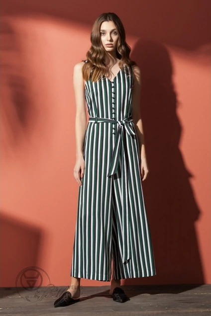 Стильный комбинезон из натуральной ткани с дизайном в полоску, прямого силуэта, с V-образным вырезом горловины. Центральная застежка на навесные петли и пуговицы. В комплекте прилагается пояс из основной ткани.