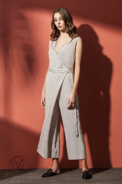 Стильный комбинезон из натуральной ткани с дизайном в полоску, прямого силуэта, с V-образным вырезом горловины, отрезной по линии талии с втачным поясом. Лиф и нижняя часть комбинезона выполнены на запах. Брюки свободного силуэта. В боковых швах обработаны функциональные карманы. В комплекте прилагается пояс из основной ткани.