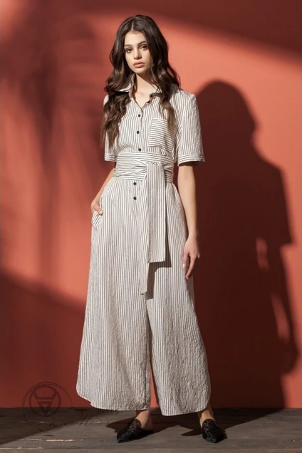 Стильный комбинезон из натуральной ткани в черно-белую полоску прямого силуэта с расширенными к низу брюками. Застёжка на петли и пуговицы чёрного цвета спереди. На полочке один небольшой накладной карман. Рукава втачные длиной до локтя с притачной манжетой по низу. Горловина обработана воротником на стойке. По талии завязывается широкий пояс-кушак. По низу брюк фигурные скруглённые разрезы по боковым швам. По спинке отрезная горизонтальная кокетка.