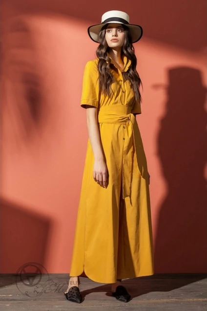 Стильный и яркий комбинезон из натуральной хлопковой ткани прямого силуэта с расширенными к низу брюками. Застёжка на петли и пуговицы в натуральном стиле спереди. На полочке один небольшой накладной карман. Рукава втачные длиной до локтя с притачной манжетой по низу. Горловина обработана воротником на стойке. По талии завязывается широкий пояс-кушак. По низу брюк фигурные скруглённые разрезы по боковым швам. По спинке отрезная горизонтальная кокетка.