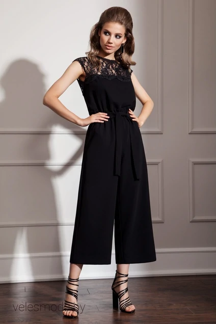 Изящный комбинезон из струящейся гладкой ткани, отрезной по линии талии. Пояс по талии собран на резинку с небольшой рюшей по верхнему краю. Лиф с кружевной кокеткой по переду и спинке со спущенной линией плеча. Спинка с V- образным вырезом и застежкой на пуговицы.