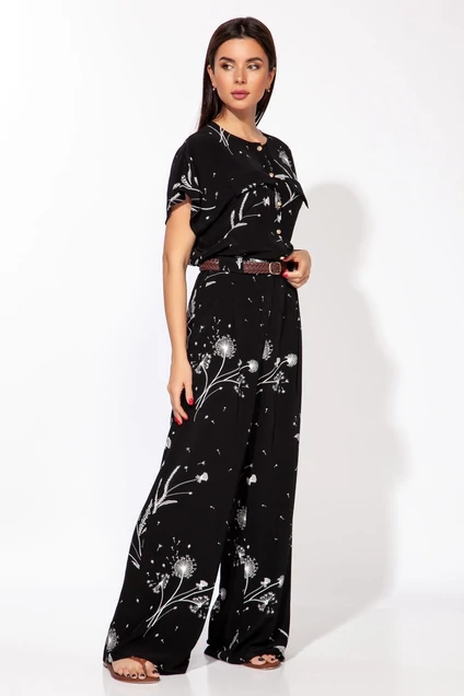 Стильный комбинезон из вискозной ткани с дизайном . Лиф комбинезона прямого силуэта с круглым вырезом горловины, с декоративными клапанами и отрезной планкой с застежкой на петли и золотые пуговицы. Линия плеча спущена. Спинка с горизонтальной кокеткой по линии лопаток. Брюки комбинезона свободные, расклешенные к низу, с двумя небольшими складками и с боковыми наклонными карманами. Пояс с резинкой по спинке и широкими шлевками для продевания ремня.