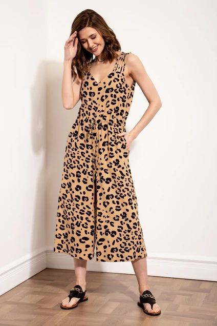 Стильный льняной комбинезон с анималистичным принтом свободного силуэта с регулируемой кулисой по талии с завязками. Лиф с V-образным вырезом переда и оригинальными тонкими бретелями по переду и спинке. Брюки до середины голени, расклешенные от бедра с боковыми карманами. Спинка с застежкой на одну пуговицу и разрезом до талии.
