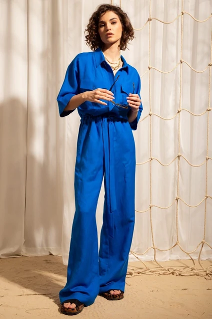 Комбинезон из льняной ткани прямого силуэта, отрезной по линии талии со съемным поясом. По переду лифа комбинезона застежка-планка на пуговицы, накладные карманы с клапанами. Лиф спинки со складкой по кокетке. По задней части брюк накладные карманы. Рукава короткие с отложными манжетами.