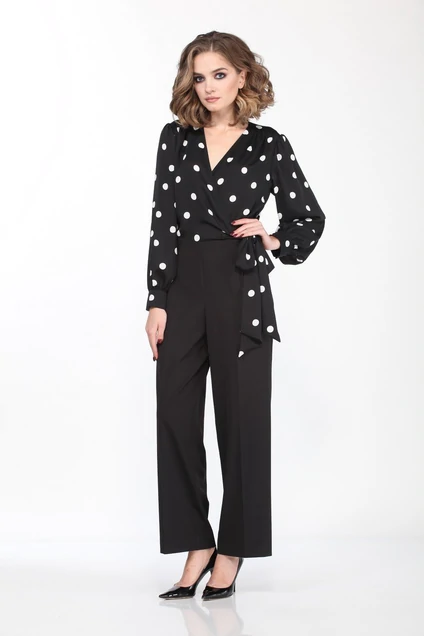 Комбинезон женский, полуприлегающего силуэта, с застежкой на потайную тесьму-молнию в среднем шве спинки, с втачным поясом на уровне линии талии, в который вставлена резинка. Лиф деталей переда комбинезона с запахом, с притачным поясом с левой стороны, с кокетками, по шву соединения кокеток - сборка. Рукава втачные одношовные, с притачными манжетами с застежкой на 3 петли и 3 пуговицы. Нижняя часть - брюки, расширенные к низу. На передних и задних частях брюк обработаны по 1 вытачке на каждой половинке. На передних и задних половинках брюк заутюжены «канты».