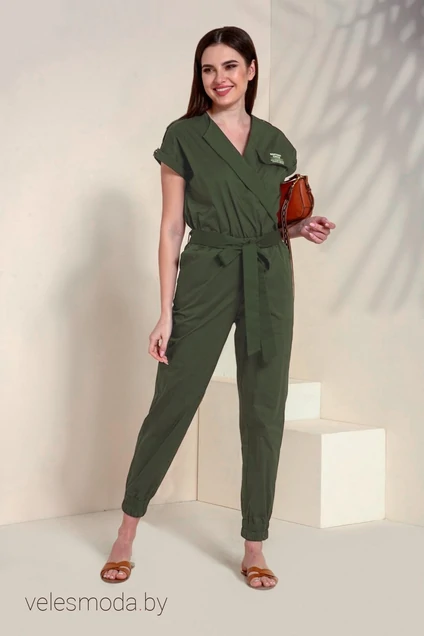 Комбинезон женский, полуприлегающего силуэта, с втачным поясом на уровне линии талии, в который вставлена резинка, со съемным поясом. Лиф деталей переда комбинезона с асимметричным запахом. На левой детали настрочен клапан, на правой по краю борта – декоративная тесьма. Проймы комбинезона обработаны притачными манжетами, по плечевым швам прикреплены «паты» с застежкой на кнопки. Нижняя часть - брюки, зауженные к низу, по низу – притачные манжеты с эластичной тесьмой. На передних половинках в боковых швах обработаны карманы. На втачном поясе прикреплены 3 шлёвки для протяжки пояса.