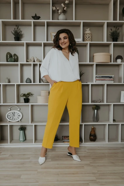 Брюки со складками и с боковыми карманами, верхний край брюк задних половинок обработан эластичной тесьмой.