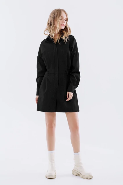 Джинсовый комбинезон с шортами. Детали: свободный силуэт, спущенная линия плеча, отрезная линия талии, рубашечный воротник, потайная планка с застежкой на пуговицы, карманы в боковых швах. Комбинезон выполнен из плотной джинсовой ткани