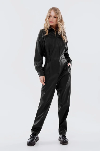 Комбинезон свободного силуэта из экокожи. Детали: спущенная линия плеча, отрезная линия талии, рубашечный воротник, потайная планка с застежкой на пуговицы, карманы в боковых швах
