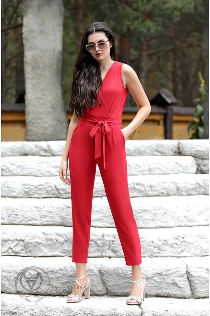 Нарядный комбинезон полуприлегающего силуэта из струящегося текстиля. Детали: V-образный вырез горловины с запахом, втачной пояс, вытачки и складки по передним и задним частям, боковые карманы, застежка на потайную молнию в среднем шве спинки Длина по спинке: 42-46=138см, 48-52=143см Длина по внутреннему шву: 42—52=71см