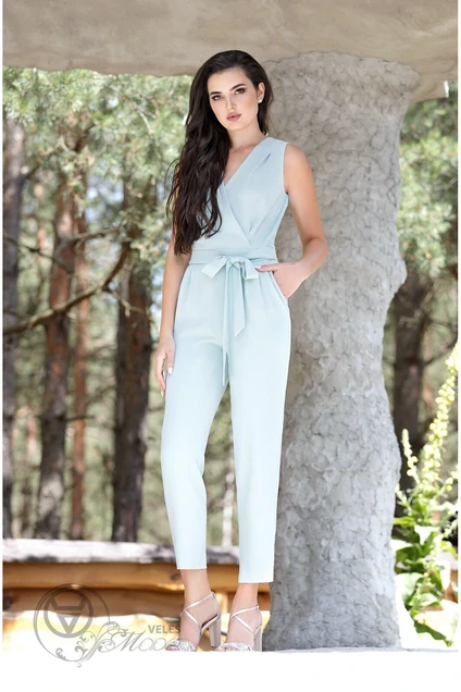 Нарядный комбинезон полуприлегающего силуэта из струящегося текстиля. Детали: V-образный вырез горловины с запахом, втачной пояс, вытачки и складки по передним и задним частям, боковые карманы, застежка на потайную молнию в среднем шве спинки Длина по спинке: 42-46=138см, 48-52=143см Длина по внутреннему шву: 42—52=71см