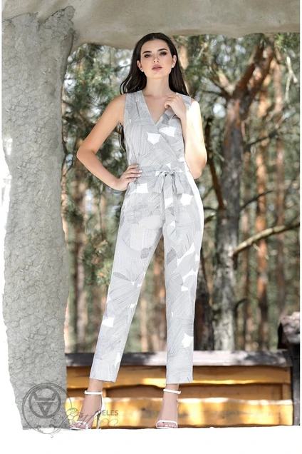 Приталенный комбинезон с запахом из принтованной текстильной ткани. Детали: V-образный вырез горловины, нагрудная вытачка-складка, пояс втачной со складками по передним и вытачками по задним частям; застежка на потайную молнию в среднем шве спинки, боковые карманы Длина по спинке: 42-46=140см, 48-52=145см Длина по внутреннему шву: 42—52=72см