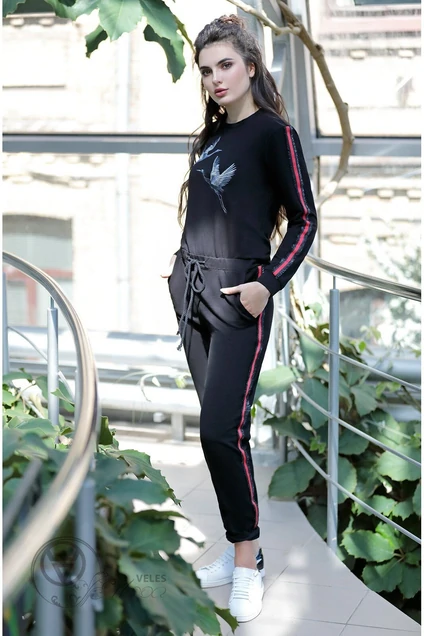 Трикотажный комбинезон в спортивном стиле с декоративной тесьмой-лампасами и вышивкой. Детали: полуприлегающий силуэт, втачной пояс на резинке с декоративными шнурками и блочками, застежка на потайную молнию в среднем шве спинки, рукава длинные на манжетах, карманы в боковых швах, по боковым швам брюк и рукавам настрочена тесьма-лампас