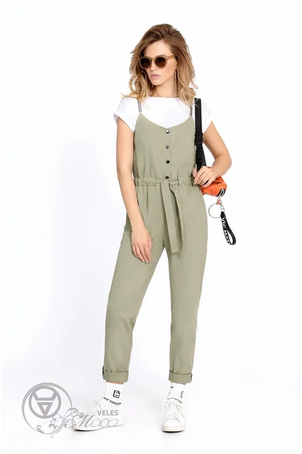 Комплект-двойка из текстильного полуприлегающего комбинезона с глубоким V-образным вырезом и трикотажной хлопковой майки. Детали: нагрудные вытачки, кулиса с поясом, застежка на металлические кнопки, спинка с втачным поясом на резинке, регулируемые бретели по длине. Майка прямого силуэта с короткими цельнокроеными рукавами на притачных манжетах Майка: дл. спинки около 56/59см Комбинезон: дл по боковому шву около 118/120см