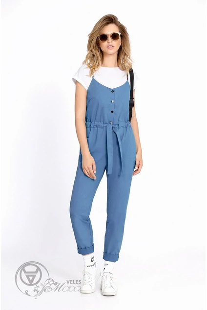 Комплект-двойка из текстильного полуприлегающего комбинезона с глубоким V-образным вырезом и трикотажной хлопковой майки. Детали: нагрудные вытачки, кулиса с поясом, застежка на металлические кнопки, спинка с втачным поясом на резинке, регулируемые бретели по длине. Майка прямого силуэта с короткими цельнокроеными рукавами на притачных манжетах Майка: дл. спинки около 56/59см Комбинезон: дл по боковому шву около 118/120см