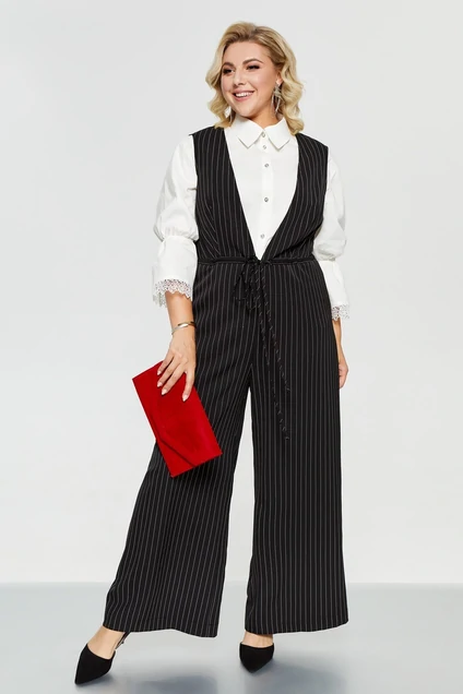 Комплект-двойка из комбинезона и блузы. Комбинезон из костюмно-плательной ткани, с V-образным вырезом горловины спереди и сзади. На деталях переда обработаны нагрудные вытачки, в боковых швах-карманы. Объём в области талии регулируется шнуром в кулисе. Блуза с центральной застёжкой на планку с пуговицами. Спереди обработаны нагрудные вытачки. Низ блузы фигурный. Рукава втачные одношовные, ниже локтя собраны на эластичную тесьму. Низ рукавов декорирован кружевной тесьмой.
