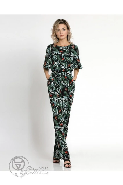 Комбинезон из принтованной вискозной ткани. Длинный, свободного покроя. Отрезной по линии талии, на резинке. С вырезом горловины «лодочка». Рукав короткий, расширенный. Застежка на пуговицу по горловине по спинке. В боковых швах карманы. Комбинезон дополняется широким поясом из основной ткани. 40 Комбинезон: Высота посадки - 26см, Длина изделия от высшей плечевой точки до низа - 150см, Длина по внутреннему шву - 79см, Длина рукава - 30см, Длина до талии - 43см, Ширина брючин сверху - 58см, Обхват брюк по низу - 47см, Ширина плеча - 6см, Ширина по бедрам - 49см, Ширина по груди - 42см, Ширина по талии - 28см, Ширина рукава - 24см 42 Комбинезон: Высота посадки - 26,5см, Длина изделия от высшей плечевой точки до низа - 150см, Длина по внутреннему шву - 79см, Длина рукава - 30см, Длина до талии - 43см, Ширина брючин сверху - 60см, Обхват брюк по низу - 47,5см, Ширина плеча - 6см, Ширина по бедрам - 51см, Ширина по груди - 44см, Ширина по талии - 30см, Ширина рукава - 24,5см 44 Комбинезон: Высота посадки - 27см, Длина изделия от высшей плечевой точки до низа - 150см, Длина по внутреннему шву - 79см, Длина рукава - 30см, Длина до талии - 43,5см, Ширина брючин сверху - 62см, Обхват брюк по низу - 48см, Ширина плеча - 6см, Ширина по бедрам - 53см, Ширина по груди - 46см, Ширина по талии - 32см, Ширина рукава - 25см 46 Комбинезон: Высота посадки - 27,5см, Длина изделия от высшей плечевой точки до низа - 150см, Длина по внутреннему шву - 79см, Длина рукава - 30см, Длина до талии - 43,5см, Ширина брючин сверху - 64см, Обхват брюк по низу - 48,5см, Ширина плеча - 6см, Ширина по бедрам - 55см, Ширина по груди - 48см, Ширина по талии - 34см, Ширина рукава - 25,5см