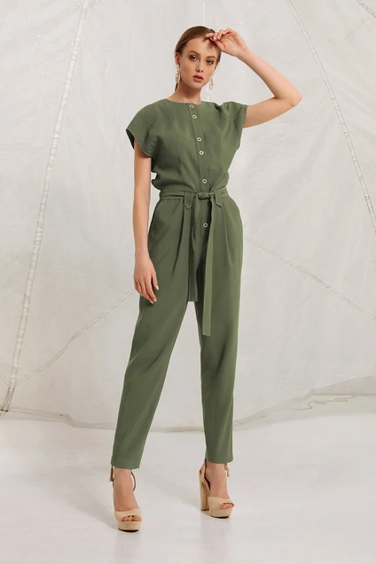 Комбинезон полуприлегающего силуэта со спущенным рукавом. По переду притачная планка с застежкой на петли-пуговицы. Отрезной по линии талии с резинкой по спинке. По переду глубокие односторонние складки с фигурными карманами. По верху спинки отрезная кокетка со встречной складкой. Съёмный пояс из основной ткани. Длина изделия — 143 см.