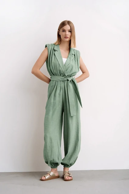 Комбинезон полуприлегающего силуэта отрезной по талии на резинке. По переду плеча сборка со вставным плечиком. Воротник пиджачного типа на запах по талии с лацканами и воротником. По центру спинку от втачивания воротника сборка. По боковым швам в области талии шлевки со съемным поясом из основной ткани. В боковых швах карманы. Низ брюк на резинке. Длина изделия — 145 см.