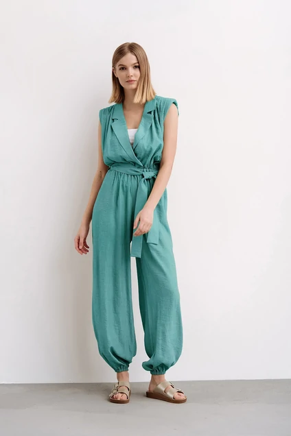 Комбинезон полуприлегающего силуэта отрезной по талии на резинке. По переду плеча сборка со вставным плечиком. Воротник пиджачного типа на запах по талии с лацканами и воротником. По центру спинку от втачивания воротника сборка. По боковым швам в области талии шлевки со съемным поясом из основной ткани. В боковых швах карманы. Низ брюк на резинке. Длина изделия — 145 см.