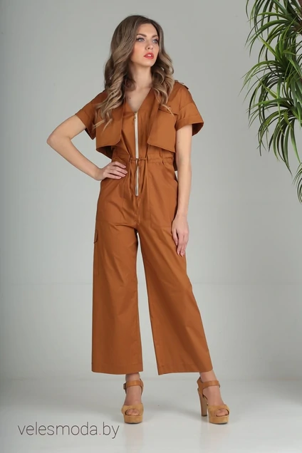 Описание внешнего вида комбинезона:Комбинезон прямого силуэта, длиной 137,0см от плечевого шва до низа, без рукава.На переде комбинезона расположены накладные карманы. На правом боковом шве настрочен карман со встречной складкой и клапаном. Клапан застегивается на пуговицу.Перед комбинезона с застежкой на металлическую молнию, длиной 37,0см.Прилегание по линии талии достигается при помощи кулисы, в которую вдевается шнур.Горловина комбинезона и проймы обработаны обтачками.
