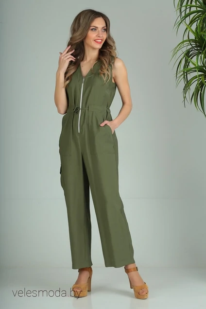 Комбинезон прямого силуэта, длиной 137,0см от плечевого шва до низа, без рукава.На переде комбинезона расположены накладные карманы. На правом боковом шве настрочен карман со встречной складкой и клапаном. Клапан застегивается на пуговицу.Перед комбинезона с застежкой на металлическую молнию, длиной 37,0см.Прилегание по линии талии достигается при помощи кулисы, в которую вдевается шнур.Горловина комбинезона и проймы обработаны обтачками.