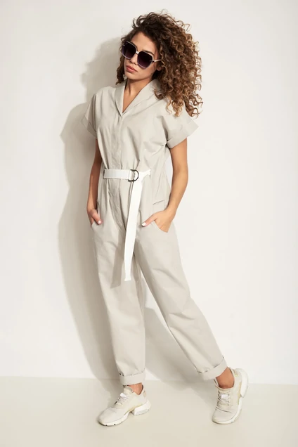 Комбинезон свободного силуэта из мягкого турецкого джинса. По спинке и по талии широкая резинка, по переду завязывается на пояс. Карманы в боковых швах. Застежка на кнопки центральная. Воротник шалька. Рукава - спущенное плечо, низ рукава обработан манжетом. По спинке кокетка и два накладных кармана. Строчки отделочные выполнены в джинсовом стиле. Длина по спинке до талии 42 см. Длина по переду до талии 44 см. Длина брюк по боковому шву от талии 98 см. Длина рукава 27 см Рост 170 см