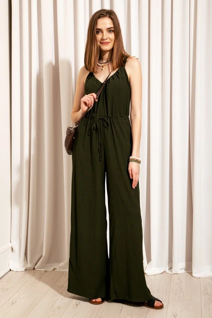 Стильный комбинезон длиной в пол из мягкой фактурной ткани с эффектом «жатки» свободного силуэта с регулируемой кулисой по талии с завязками. Лиф с V-образным вырезом переда и оригинальными тонкими бретелями по переду и спинке. Спинка с застежкой на одну пуговицу и разрезом до талии. В боковых швах обработаны карманы.