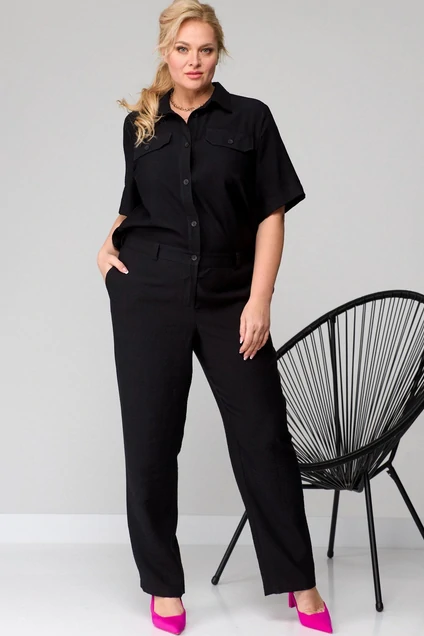 Можно ли быть стильной в большом размере!? Смело отвечаем, можно! Это отличный вариант для офиса и для прогулки с подругами. Комбинезон выполнен из вискозной ткани. Отрезной по линии талии с отлетной по спинке, в пояс по спинке вставлена резинка, есть съемный пояс.