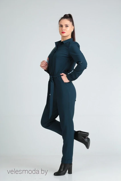 Комбинезон женский, полуприлегающего силуэта, с втачными рукавами, отрезной по линии талии. Лиф переда с нагрудными вытачками, с застежкой, обработанными планками, на петли и пуговицы . Лиф спинки цельный. Горловина обработана воротником типа рубашечный. Рукава длинные , по низу с притачным манжетом, застегивающийся на петлю и пуговицу. Брюки прямые, с наклонными боковыми карманами. По низу брюк – манжеты. На талии выполнена легкая сборка. Размер 48: Длина 148 см. Длина рукава – 61 см