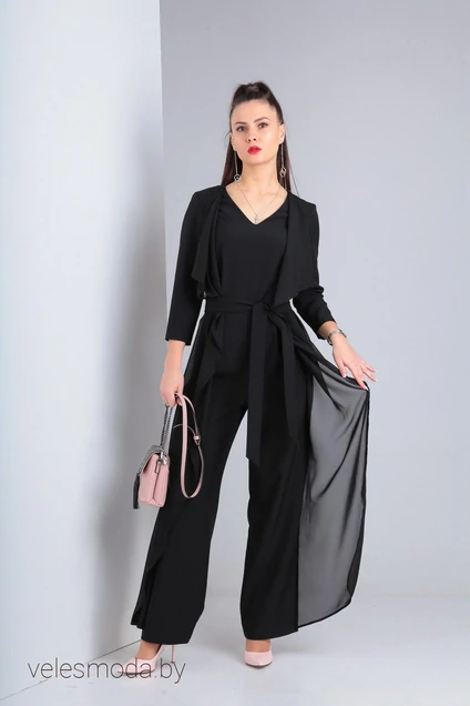 Комбинезон женский, прилегающего силуэта, с втачным рукавом, отрезной по линии талии, с отлетными деталями по переду из шифона. Лиф переда с нагрудными вытачками, мягкими складками, идущими от талии, с вырезом горловины V-образной формы. Лиф спинки со средним швом и талевыми вытачками. Рукава втачные, короткие. Брюки прямые, передние половинки с мягкими складками, идущими от талии, задние половинки с талевыми вытачками. Застежка в среднем шве спинки на потайную тесьму-молнию. Отлетной пояс, завязывающийся на талии на бант. Передние половинки брюк и половинка пояса выполнены из отделочного материала.