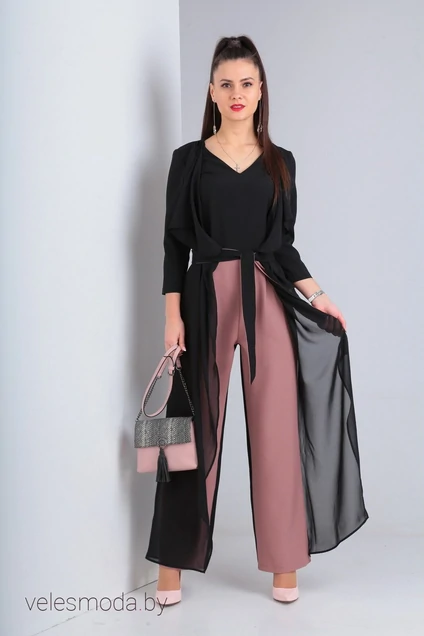 Комбинезон женский, прилегающего силуэта, с втачным рукавом, отрезной по линии талии, с отлетными деталями по переду из шифона. Лиф переда с нагрудными вытачками, мягкими складками, идущими от талии, с вырезом горловины V-образной формы. Лиф спинки со средним швом и талевыми вытачками. Рукава втачные, короткие. Брюки прямые, передние половинки с мягкими складками, идущими от талии, задние половинки с талевыми вытачками. Застежка в среднем шве спинки на потайную тесьму-молнию. Отлетной пояс, завязывающийся на талии на бант. Передние половинки брюк и половинка пояса выполнены из отделочного материала.