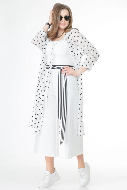 Легкий летящий кардиган из прозрачной органзы с бархатными горошками. Прямого силуэта с разрезами по боковым швам. По горловине капюшон. Рукав втачной. Вместо застежки -ленты, которые можно завязать по переду.